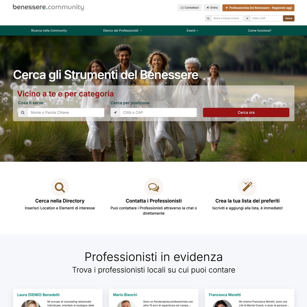 Benessere.Community is the interactive platform of the AltroStile ecosystem. It connects users and wellness professionals through a geolocated search for services, courses, and events. It offers professionals a digital showcase with booking and promotion tools, and provides users with a specialized social network for sharing and personal growth. It unites people and skills for an integrated well-being.